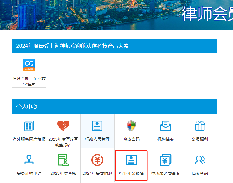2、進(jìn)入“會(huì)員中心”,選擇“個(gè)人中心”的“行業(yè)年金報(bào)名”。