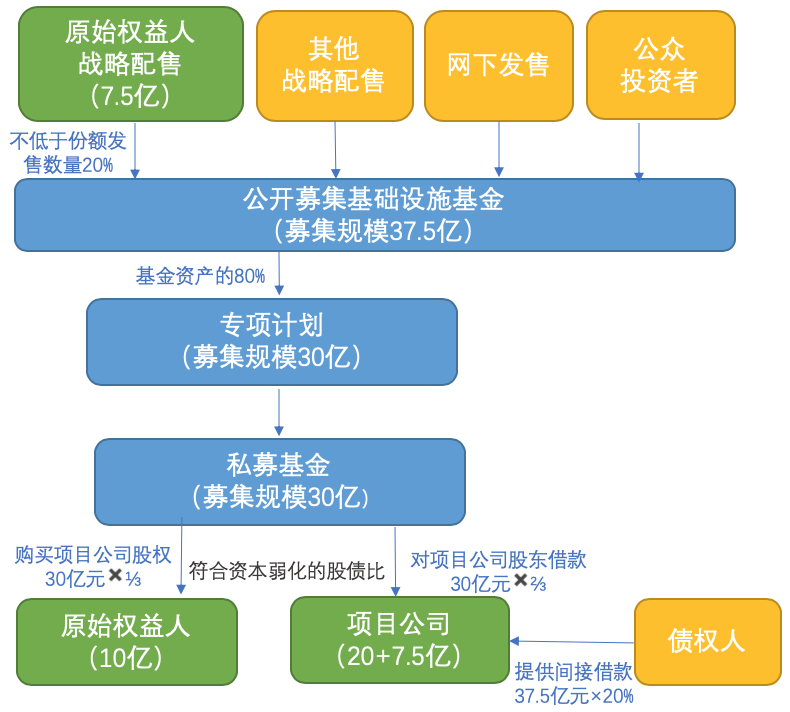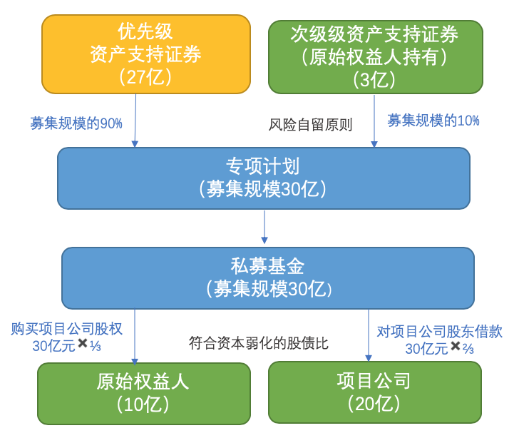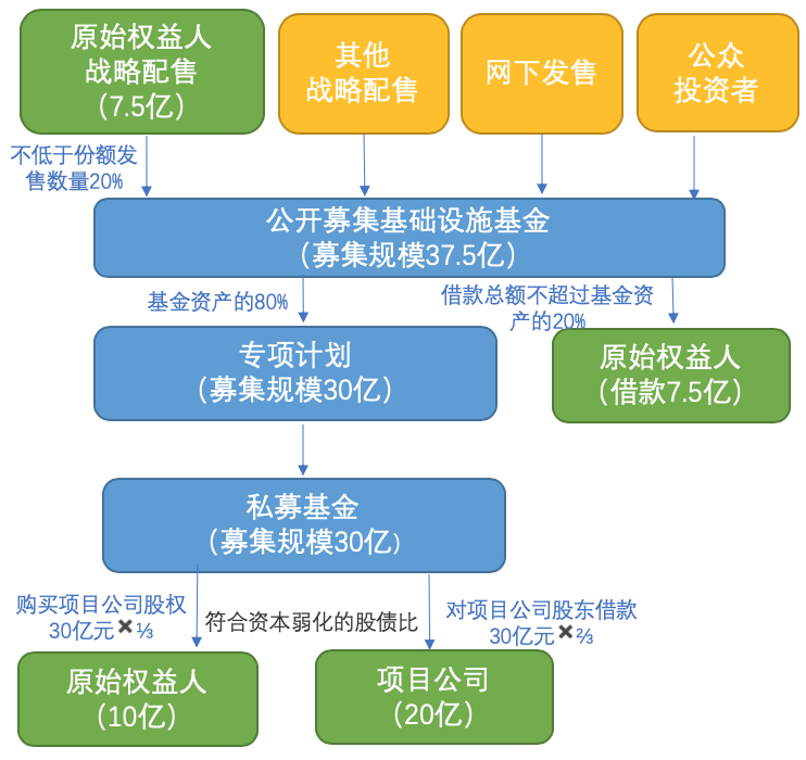 通過以上整體安排,類REITs項目融資方(即原始權(quán)益人和項目公司)實際募集資金總額應(yīng)為: