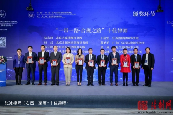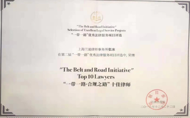 2019年12月22日,由法制日報社主辦、法制網承辦的第二屆“一帶一路”優秀法律服務項目頒獎典禮暨“一帶一路”法律服務高端論壇在北京隆重舉行。上海蘭迪律師事務所張冰律師榮膺“一帶一路?合規之路”十佳律師。