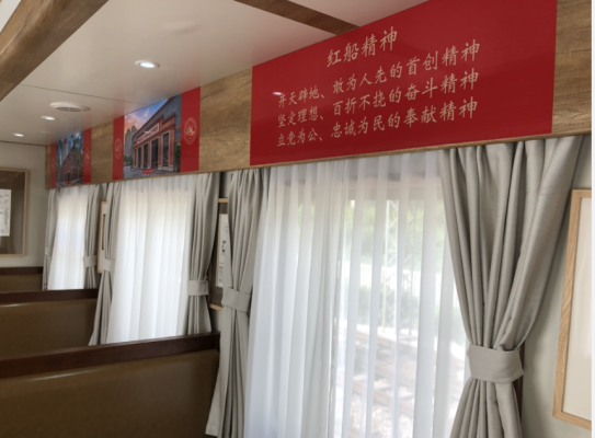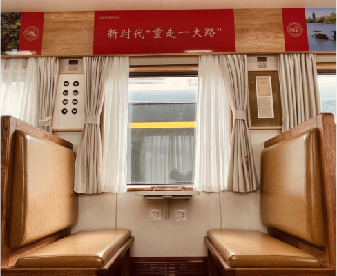 由“周恩來號(hào)”機(jī)車牽引的“南湖·1921”紅色教育主題列車,車體涂裝采用紅綠配色,一條金黃色腰線貫穿車身,格外鮮艷奪目。車廂的座位上方掛有1921年上海至嘉興的列車時(shí)刻表、1918年的嘉興地圖和南湖全景圖、上世紀(jì)20年代的南湖煙雨樓老照片、上世紀(jì)30年代的南湖游船老照片、門票和擺渡票等等。同志們深刻浸潤(rùn)在紅色氛圍之中,仿佛回到了百年前的那個(gè)開天辟地的日子。