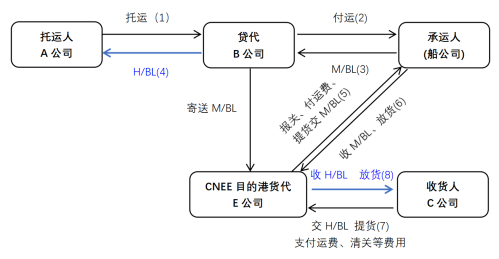 此種情況下,船公司將提單副本傳給貨代填寫信息,提單上的托運人填貨代名,收貨人填貨代在目的港的代理;貨代在確認后,提出電放申請;承運人同意的,將電放信或者電放號傳給貨代;最后由貨代在目的港的代理人從承運人目的港代理中提貨。另一方面,貨代公司簽發正本的貨代提單給托運人,提單上的托運人填托運人的名稱,收貨人填目的港收貨人的名稱,目的港的收貨人憑該提單的正本在目的港,從貨代公司代理手中提貨。