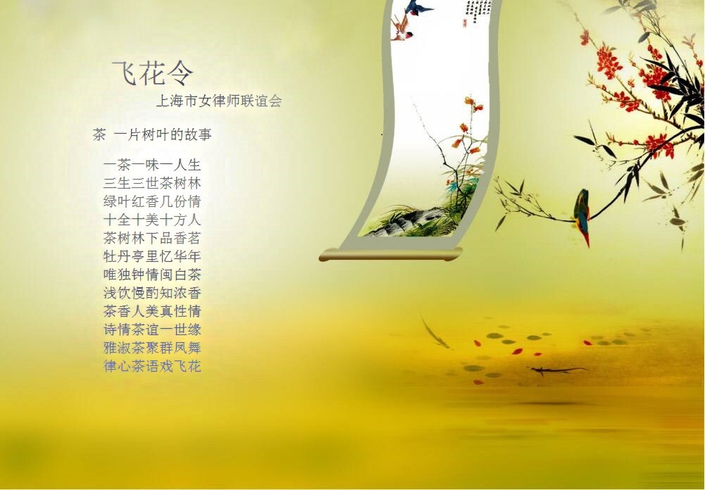 最精彩的飛花令將本次活動推向了高潮,規則是將一朵玫瑰在大家手中傳遞,待主持人說“停”的時候,鮮花停留在誰的手上,這位女律師就要即興作詩一句。游戲進行的熱火朝天,沒有拿到花女律師們也自告奮勇參加,最終大家的智慧結晶凝結成了一首美妙的詩詞:一茶一味一人生,三生三世茶樹林,綠葉紅香幾份情,十全十美十方人。茶樹林下品香茗,牡丹亭里憶華年,唯獨鐘情閩白茶,淺飲慢酌知濃香。茶香人美真性情,詩情茶誼一世緣,雅淑茶聚群鳳舞,律心茶語戲飛花。