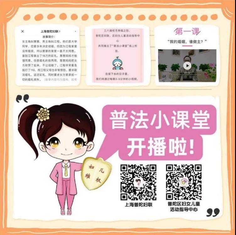 “三·八維權月”期間,普陀區婦聯、區婦女兒童活動指導中心和區女律師聯誼會共同推出“普法小課堂”線上欄目,分享婚姻、家庭相關的法律小知識。