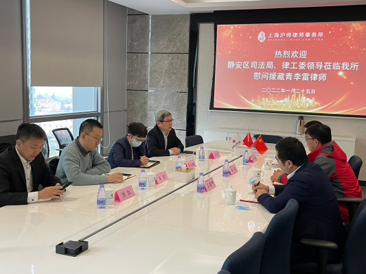 2022年1月25日,靜安區司法局副局長李成梅、靜安律工委主任王昊東、副主任陳凱等一行赴上海滬師律師事務所慰問靜安區援藏律師李雷。