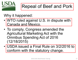 6.3.1.案情:美國要求零售端的各種產品標簽注明出產國(country of origin labeling,首字母縮寫是COOL,相當于真棒的意思),各種肉品也要標注,加拿大和墨西哥針對牛肉和豬肉提出異議,認為這種標簽構成歧視。WTO裁決官認為異議有理,因為這個標簽規則不強制要求區隔各國產品,但貫徹這個標簽要求,先要將肉品按來源國分開,然后才能附上有標有出產國的標簽,這會增加零售商操作難度,導致他們更愿意只進美國貨品,不要外國貨。而且這種標簽做法沒體現“一碗水端平”( lack "even-handedness")。相對于食品其他信息如生產日期,檢疫,肉品等級等,出產國信息并沒有突出的重要性,但卻能引起消費者不成比例的重視程度,因此這種標簽政策構成歧視。美國敗訴后,美國農業部從零售端標記出產國的商品名錄中撤除了牛肉和豬肉,但其他肉品未受影響,仍要做出產國標記。