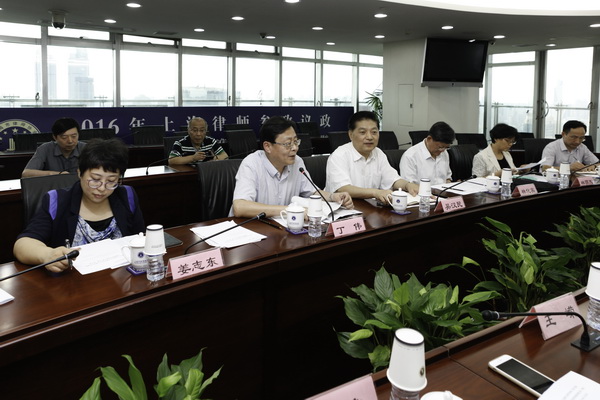 8月18日下午,市人大常委會副主任吳漢民帶隊,市人大法制委主任委員林化賓、市人大法制委副主任委員、常委會法工委主任丁偉、市人大常委會副秘書長、常委會法工委副主任林蔭茂、市人大常委會法工委辦公室主任姜志東、市人大常委會法工委立法一處處長沈建明、市人大常委會法工委立法二處副處長崔凱一行7人蒞臨市律協,就《上海市道路交通管理條例(修訂草案)》、《上海市公共場所控制吸煙條例修正案(草案)》召開座談會,聽取律師意見。