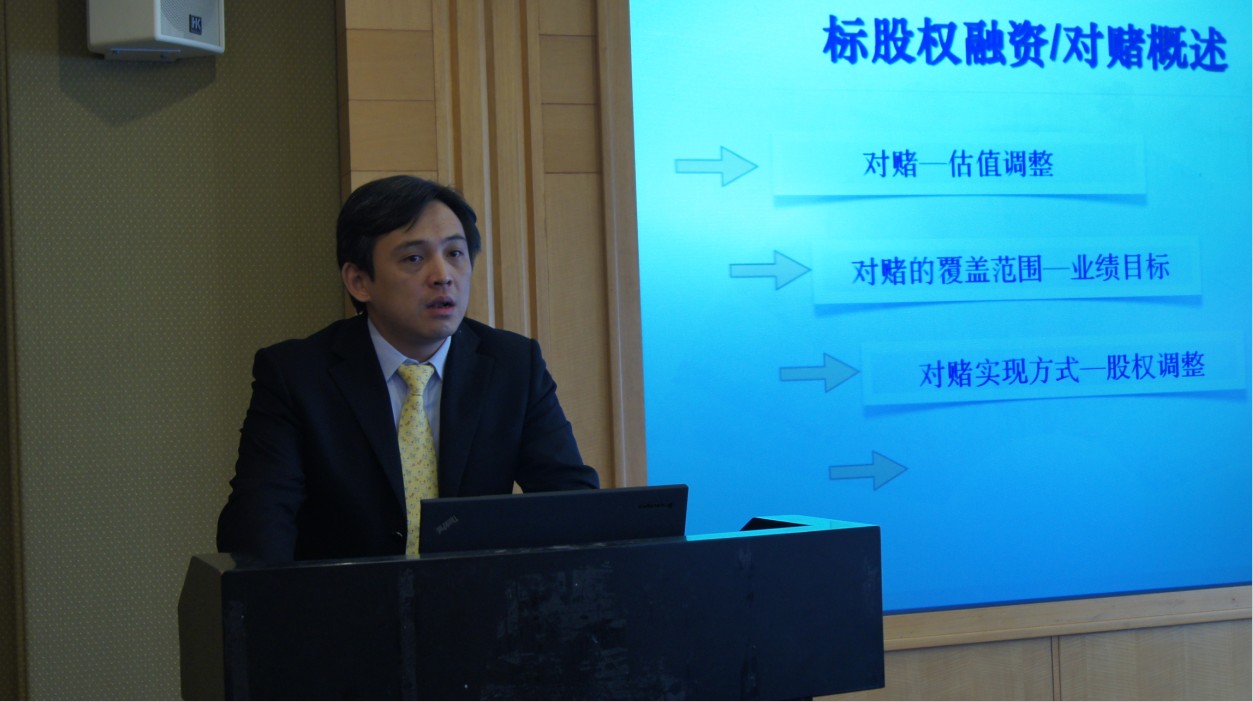 作為嘉華所資深的公司及投融資律師,風(fēng)度翩翩的徐懷宇律師面對現(xiàn)場來賓以及諸多股權(quán)融資方面的專家,侃侃而談。他首先剖析了對賭的核心——估值調(diào)整,結(jié)合實例,將極具專業(yè)性的財務(wù)公式闡釋的通俗明白。隨后又從董事會、高管、上下游、稅務(wù)四個層面分析公司治理要求,揭示對賭中可能出現(xiàn)的重大風(fēng)險和規(guī)避方法,以真實案例向大家介紹對賭借助外部力量,解決內(nèi)部問題的“妙用”。徐律師的講課條理清晰,將“股權(quán)融資”這一復(fù)雜又較高端的主題處理的內(nèi)容緊湊、豐富,專業(yè)性極強,與會來賓深感兩小時課程含金量頗高,受益匪淺。