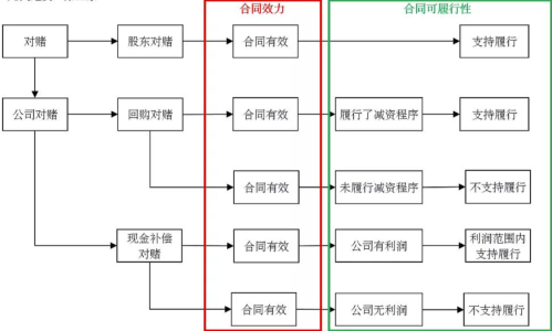 總體來看,《九民紀要》主要是從合同效力和合同可履行性兩個維度來進行規定。從合同效力上來看,不管是公司對賭還是股東對賭,都被認為是有效的。但在合同可履行性維度中,與公司的對賭設立了門檻,即股權回購需要履行減資流程,現金補償需要公司有利潤。