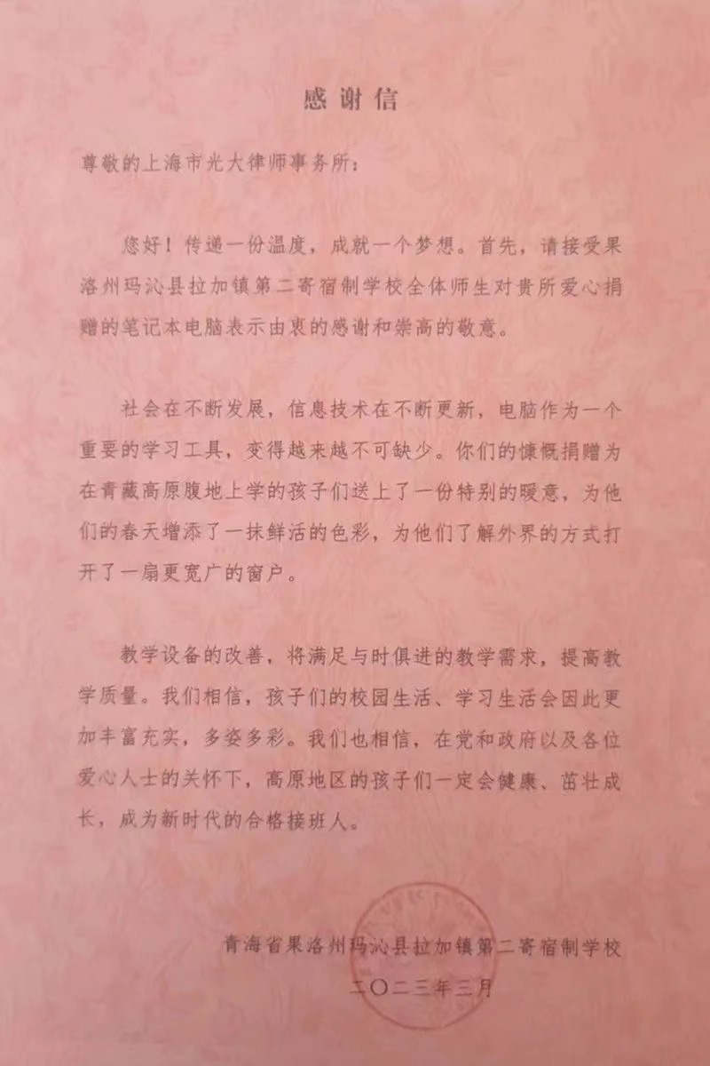 青海省果洛州瑪沁縣拉加鎮第二寄宿制學校送來的感謝信