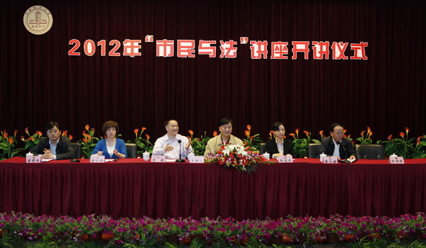 2012年5月23日下午, 由市人大、市法宣辦、市律師協會主辦的2012年“市民與法—人大代表說法系列”講座開幕儀式在華政附中五樓多功能廳隆重舉行。市人大常委會副主任王培生、市人大常委會副秘書長、市人大常委會培訓工委副主任楊佳瑛、市人大常委會辦公廳副巡視員陳國齡、市法宣辦副主任、市司法局副局長蔡永健、市律協會長盛雷鳴、長寧區人大常委會副主任余小雄等領導在主席臺就坐。來自各區縣人大、區縣司法局、市律協調研部、社區代表以及華政附中師生代表等三百余人參加了本次開講儀式。開講儀式由市人大常委會辦公廳副主任徐毅主持。