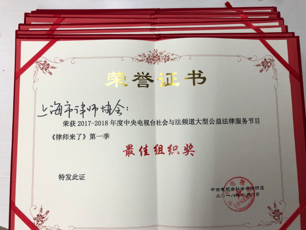 央視《律師來了》節(jié)目第一季圓滿結(jié)束,總結(jié)會上,全國共有150余位律師獲獎,上海律師就有22位。其中,王思維、周文宣、張姍姍、張玉霞、王常棟、嚴(yán)嫣、趙山、閆艷、付忠文共9位律師獲“最佳公益獎”,田思遠、楊穎琦、王丹丹、范曉峰、宋安成、彭振華、孫歡成、葉正偉、孫亮、李淑芹、謝向英、郭亮、謝恬共13位律師獲“優(yōu)秀法律顧問獎”,上海市律師協(xié)會獲“最佳組織獎”。