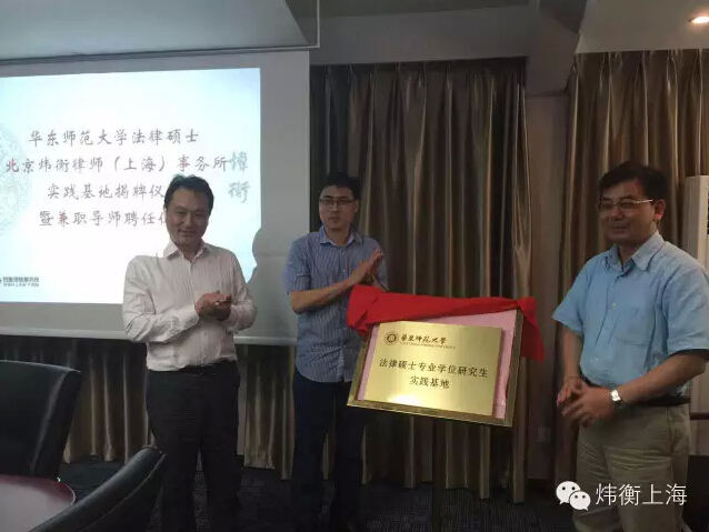 馬愛民主任首先介紹了華東師范大學各實踐基地的情況,然后由實踐基地合作雙方負責人扈斌律師與王景斌老師向來賓分別介紹基地建設情況及對基地未來發展的設想,并代表合作雙方簽署了合作協議。華東師范大學副校長郭為祿、長寧區司法局黨委書記李世樑、實踐基地本所負責人扈斌律師共同為實踐基地揭牌,郭為祿副校長代表華東師范大學向本所扈斌、顧靖、吉劍青、郭俊、劉棟律師頒發了兼職碩士生導師的聘書。