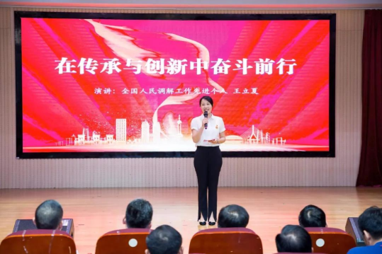 ▲ 全國人民調解工作先進個人王立夏傳承“上海001號調解員”楊伯壽及“全國模范人民調解員”韋登義等英模先輩精神,娓娓講述她《在傳承與創新中奮斗前行》的故事。