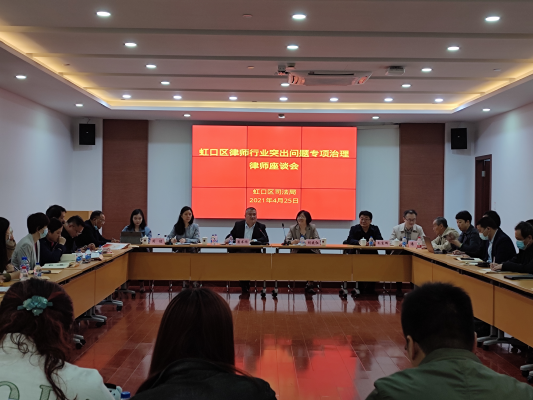 為加強律師行業規范化建設,推動律師行業提高思想認識,不斷提升廣大律師的政治素質和業務水平。4月25日下午,虹口區司法局召開“虹口區律師行業突出問題專項治理”律師座談會。市律協副會長、市律師行業突出問題專項治理督導組第八組組長潘書鴻,市律協副秘書長潘瑜及市局律師組朱東輝出席座談會。座談會由區律師行業黨委書記、副局長胡曉紅主持,本區近年來未收到投訴的律師事務所主任、黨組織負責人40余人參加座談會。