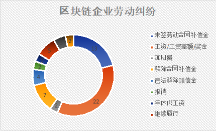 再次是勞動爭議34例,均是區塊鏈企業經營管理中發生的勞動糾紛。其中涉及最多的是未足額支付工資獎金而要求補發工資獎金或補足工資差額,有22例,其次是主張未簽訂書面勞動合同雙倍工資差額,有13例,主張解除合同補償金有7例,其他主張違法解除勞動合同賠償金、繼續履行勞動合同、加班費、年休假等均有發生。