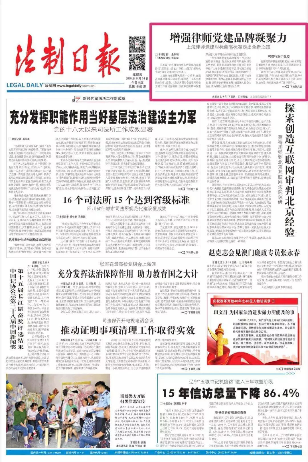 今日(9月14日),《法制日報》在頭版報眼刊發《增強律師黨建品牌凝聚力》一文,報道律師黨建的“上海之路”。