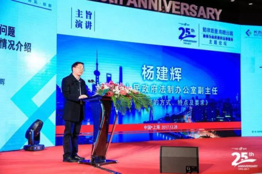 2017年12月28日下午,“依法治國——律師為政府提供法律服務”論壇在上海綠地萬豪酒店成功舉辦。出席本次論壇的嘉賓有:住建部建筑市場監管司綜合處處長陳波,北京市通州副中心發展顧問林濬,解放軍陸軍指揮學院法律維權辦公室主任、軍委機關事務管理總局法律顧問黃偉,長沙市人民政府法制辦公室副主任楊建輝,青海省建設廳黨組成員、總工程師熊士泊,內蒙古律師協會會長巴布,浙江省律師協會秘書長陳三聯,東南大學法學院副院長高歌,南開大學法學院教授、博士生導師何紅鋒,天津建設工程造價管理協會會長、天津理工大學教授、博士生導師尹貽林,青海樹人律師事務所主任陳巖,天津市森宇建筑技術法律咨詢集團總裁徐鋼,上海建工集團股份有限公司企業管理部總經理、法務部主任許海峰,上海市住房和城鄉建設管理委員會法規處處長陳榮根,原上海建工集團董事長石禮文,《建筑時報》社總編余凱凱、長征醫院副院長白立新,上海建工二建集團法務部總經理蔡玉紅,上海建工四建集團法務部總經理顧建斌,《建筑時報》社新聞部主任孫賢程,畢馬威中國高級合伙人李煒等相關部門、協會、機構的領導與專業人士,以及上海市建緯律師事務所上海總所,各地分所的主任、合伙人及律師,共近四百人參會。