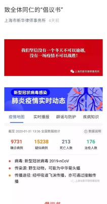 2月1日,區律師行業黨委、區律工委面向全區律師發出了抵御新型病毒疫情倡議書,動員全區律師努力踐行社會責任,助力打贏此次疫情防控狙擊戰。
