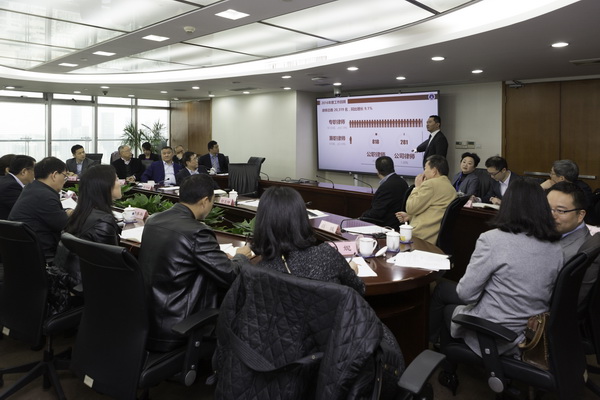 市律協會長俞衛鋒首先向薛潮主任一行匯報了市律協過去一年的主要工作情況,重點介紹了律師行業信息化建設,以及推動律師參政議政方面等工作的情況。薛潮副主任認真聽取了俞會長的匯報,就其中部分工作進行了更細致的詢問,并充分肯定了律師協會的工作。