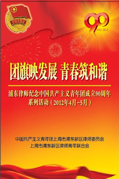 為紀念中國共產主義青年團成立90周年,經浦東新區律師黨委同意,浦東律師團委、浦東律師青聯將于2012年4月—5月聯合舉辦以“團旗映發展、青春筑和諧”為主題的系列紀念活動,包括公益法律咨詢、青年律師籃球賽、主題征文暨優秀團員評選、紅色藏品展等,并將在五四青年節召開浦東律師一屆二次團代會。