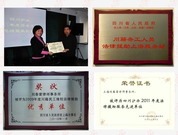 劉春雷所榮幸地成為四川省人民政府駐上海、江蘇、山東、安徽辦事處川籍務工人員法律援助站,連續三年蟬聯四川省人民政府上海辦事處法律援助先進集體。凸顯了心系民眾、服務為民的執業宗旨,樹立了律師良好社會形象。