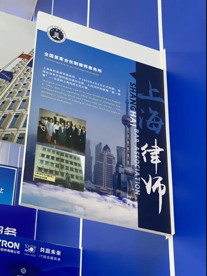 此外,上海共有15家律師事務所受邀通過現(xiàn)場或線上參展。在上海主賓市展區(qū)的文化服務、法律服務展區(qū),展陳著記載上海律師行業(yè)發(fā)展的多幅海報。