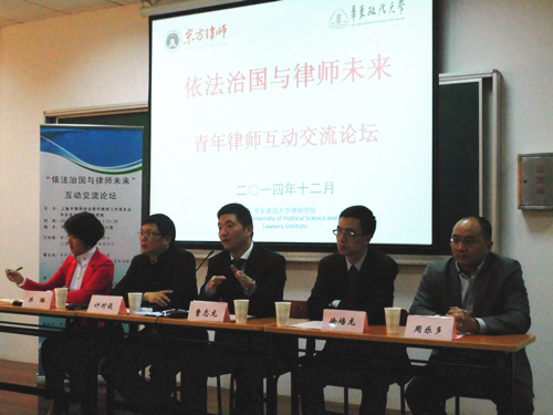為認真貫徹四中全會精神,積極鼓勵引導青年律師進一步增強全面推進依法治國的責任感和使命感,12月5日下午,市律協青年律師工作委員會赴華東政法大學律師學院開展了品牌活動——“對話校園”。作為“憲法日主題月——青年律師在行動”系列活動之一,本次活動以“依法治國與律師未來”為主題,邀請了第三屆上海市優秀青年律師計時俊,第四屆上海市優秀青年律師曹志龍、徐培龍、韓璐和第五屆上海優秀青年律師周樂多擔任嘉賓。