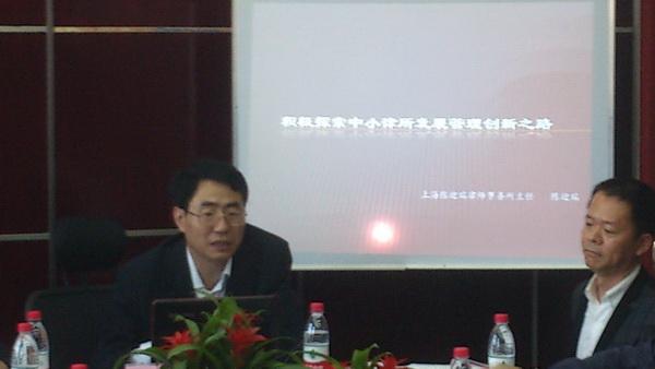 會議由上海市律師協會副會長周天平主持,聯盟陳迎瑞律師作了綜合主題發言,介紹了聯盟的組建背景和具體做法、聯盟運作的“六加一”管理制度模式、聯盟的集體工作機制和文化建設、聯盟注重履行社會責任提供優質法律服務做大做強業務的體會,顧劍棟律師介紹了聯盟黨建工作和自身業務發展情況。會上各區縣律工委主任、副主任還詢問了聯盟如何解決所際利益沖突,內部管理細節,案源分配情況,帶教青年律師等問題,陳迎瑞律師逐一進行了回應。