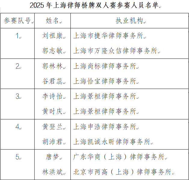 5.裁判長(zhǎng)、記錄員等工作人員由2025年上海律協(xié)律師橋牌雙人賽賽事組選派;
