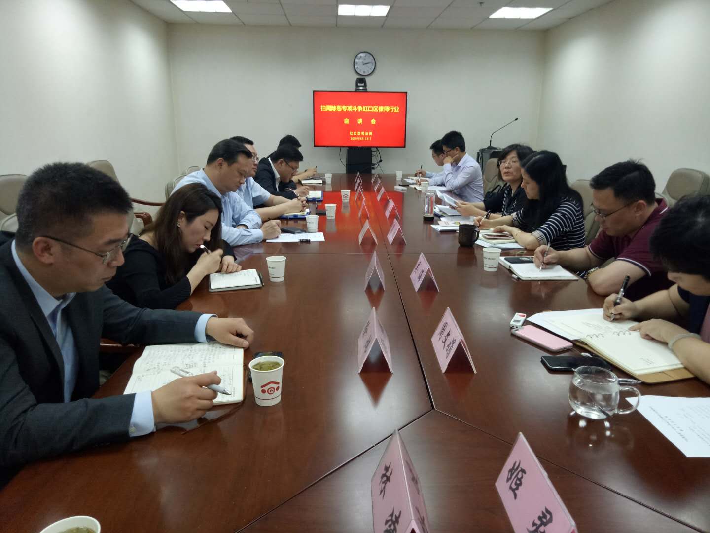 2019年6月13日下午,虹口區(qū)司法局召開掃黑除惡專項斗爭虹口區(qū)律師行業(yè)座談會。區(qū)司法局副局長、區(qū)律師行業(yè)黨委書記胡曉紅、區(qū)司法局律公科科長周俊以及部分律師代表參加了會議。