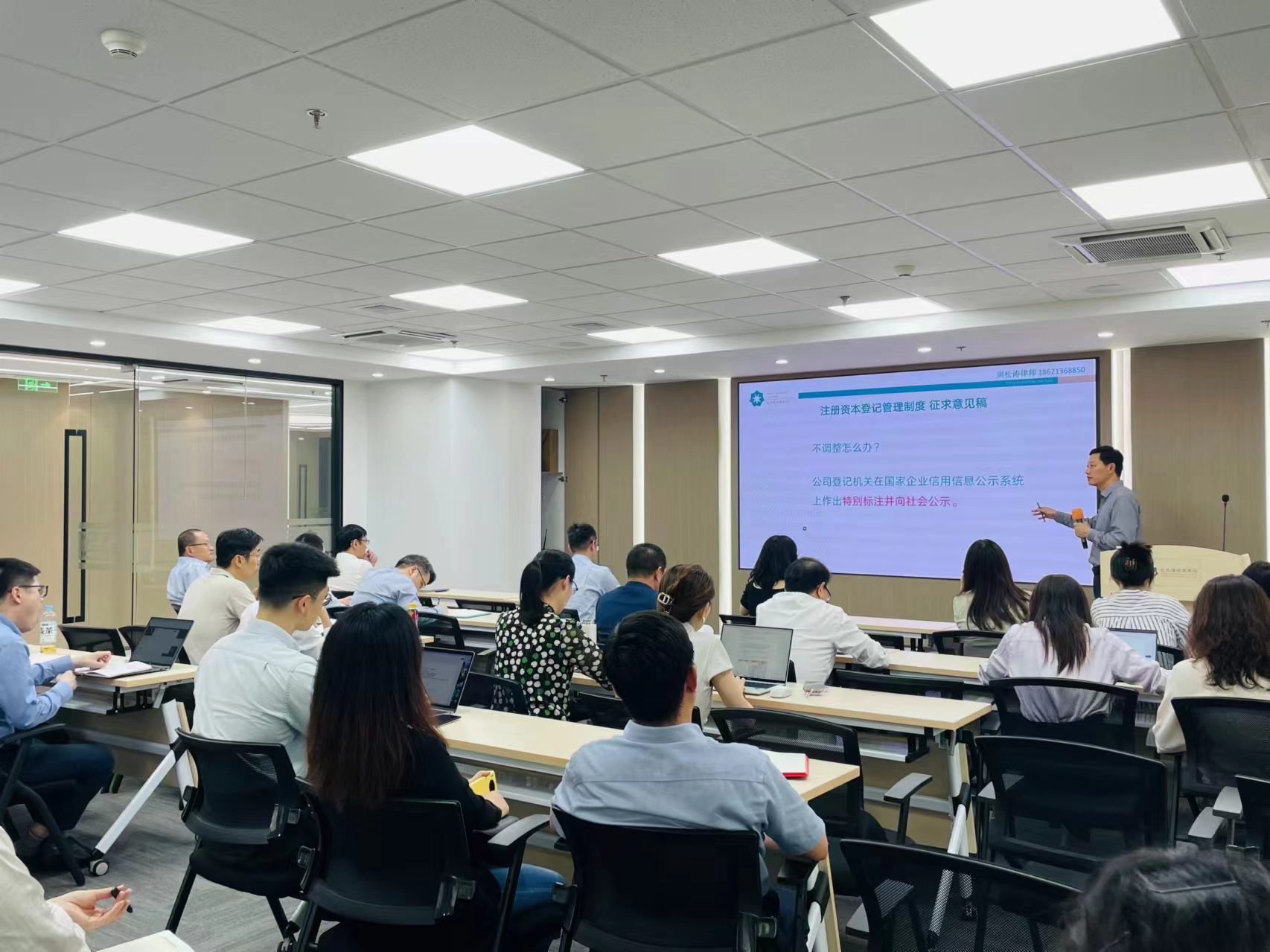 周松濤律師以新《公司法》的修改調整為立足點,從過渡期注冊資本調整、法定代表人辭任、股權轉讓出資責任、股東失權、董監高義務等備受關注的熱點問題出發展開典型案例的講解,為在場律師答疑解惑。