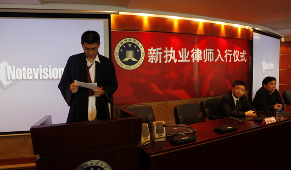 上海市君悅律師事務所合伙人劉習赟律師向在座的新律師分享了他多年來的執業理念,他向各位新律師提出了四點中肯意見:1、“沒有規矩,不成方圓”,作為一名律師,要謹記遵紀守法,2、“工欲善其事,必先利其器”,律師必須要有自己的專業技能;3、“千里之行,始于足下”,律師要在一點一滴中積累經驗。點滴之間見功夫,細微之處見發展。4、專業和團隊成就律師的光榮與夢想,新律師只有找準專業方向,依靠團隊力量,方能讓自己的執業之路越走越寬闊。最后,劉律師再次向各位新律師送上最真摯的祝福,并帶領大家宣讀新律師誓詞。