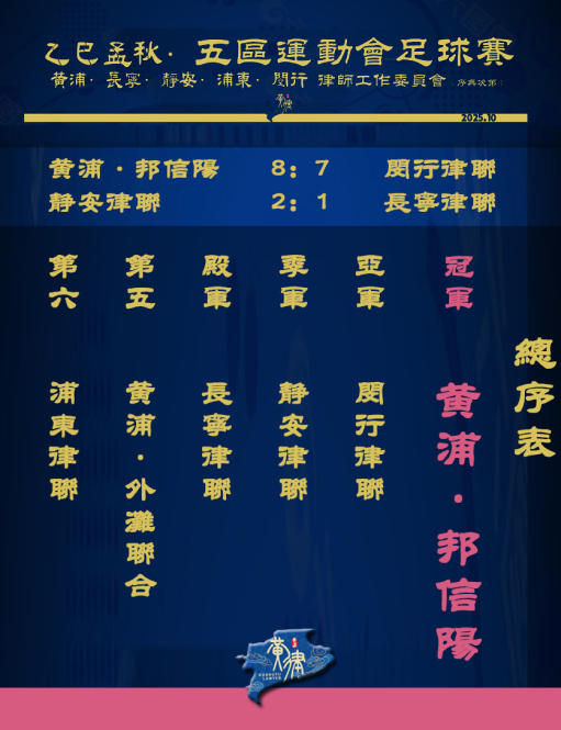 2025年11月12日,2025上海五區律師活力運動匯足球賽迎來最終決戰。黃浦·邦信陽挑落實力強勁的閔行律聯,經過緊張艱苦的點球大戰逆轉戰勝對手,勇奪桂冠。
