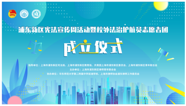 值此我國第四個憲法宣傳周及“12.5”世界志愿者日到來之際,2021年12月3日,浦東新區憲法宣傳周活動暨校外法治護航員志愿者團成立儀式于華東師范大學第二附屬中學前灘學校報告廳順利舉行。