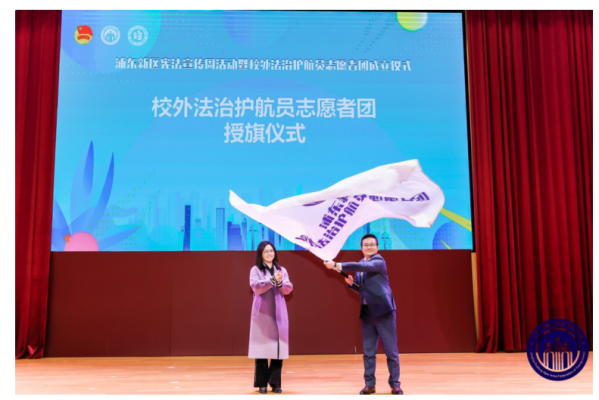 浦東新區團區委書記、區青聯主席林廷鈞向浦東校外法治護航員志愿者團團長、浦東律師青聯會長儲小青授志愿者團團旗。