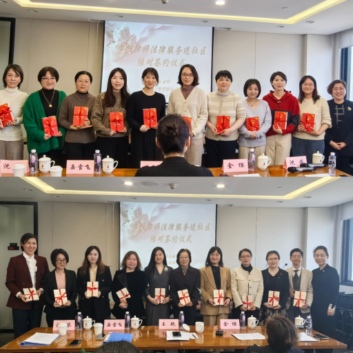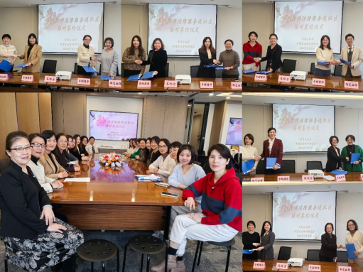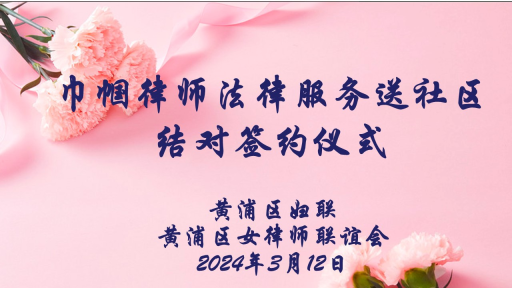 2024年3月12日下午,由黃浦區婦聯、黃浦區女律師聯誼會共同在上海市金茂律師事務所JM-Lady婦女之家舉辦“巾幗律師法律服務送社區結對簽約儀式”,黃浦區婦聯主席王艷、副主席沈茜,區女律聯會長金纓、市女律聯副會長岳雪飛、區女律聯副會長沈琴、黃浦區十個街道的婦聯主席、女律聯理事以及參與結對工作的女律師代表等出席。活動由區婦聯沈茜副主席主持。