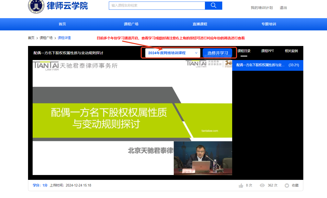 網絡培訓通過登錄律師云學院完成:選擇2024年度網絡培訓課程,即可學習2024考核年度的培訓課程(2024年度網絡培訓課程學習時間截止至2025年4月30日(含當日)已延長至6月30日)。