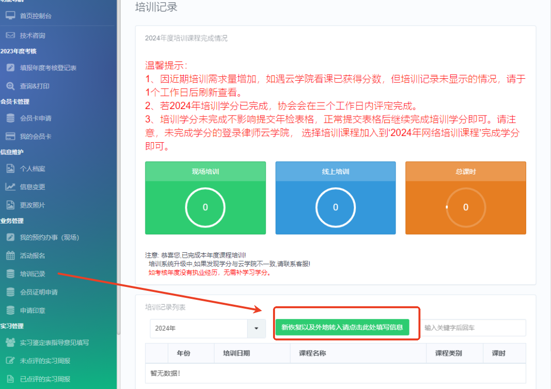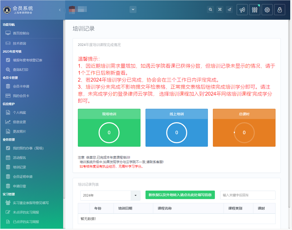 2024年度的學習課時完成情況,律師可通過東方律師網或“上海律師”APP,進入會員中心-培訓記錄,查詢成績。