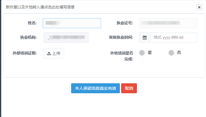 點擊圖片中標紅框的位置“新恢復及外地轉入請點擊此處填寫信息”,上傳培訓證明材料并確認“本人承諾信息真實有效”。