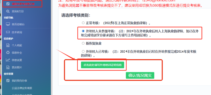 也可在年度考核開啟后,進入考核填報頁面,選擇“外地轉入未參加考核”項后在下方點擊直接填寫相關信息。