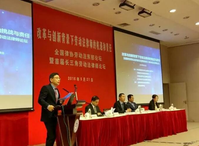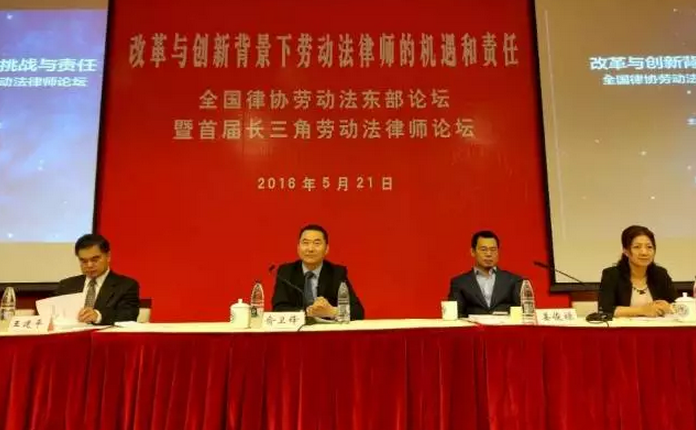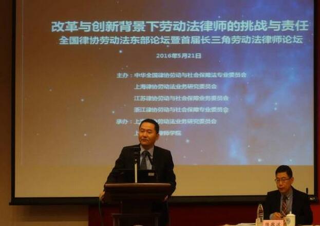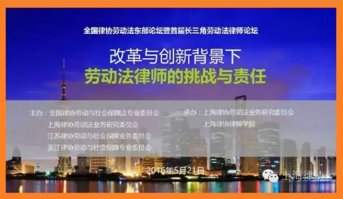 2016年5月21日,全國律協勞動法東部論壇暨首屆長三角勞動法律師論壇在上海交大懿德樓2樓報告廳勝利舉行。此次論壇由全國律協勞動與社會保障法專業委員會、上海律協勞動法業務研究委員會、江蘇律協勞動與社會保障業務委員會及浙江律協勞動與社會保障專業委員會主辦(以下均簡稱為“勞委”),上海律協勞動法業務研究委員會、上海律協律師學院承辦,以“改革與創新背景下勞動法律師的挑戰與責任”為主題,圍繞“互聯網+”勞動法,大眾創業、萬眾創新與勞動法律師業務,以及經濟下行、供給側改革與勞動法律師業務三個議題召開。上海律協會長俞衛鋒、中國社會法學會副會長姜俊祿、全國律協勞專委主任王建平、上海律協副會長鄒甫文,以及湖南省人社廳、上海市人社局、上海市高院、上海市勞動仲裁院、上海市二中院、上海市總工會的領導和專家應邀出席。來自全國各地的200余名勞動法專業律師參與本此論壇。群賢畢至,勞動法精英匯聚一堂。