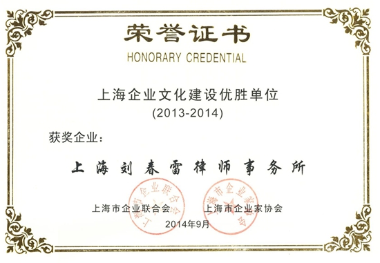 2013—2014年上海企業文化建設成果評審自啟動以來,歷經單位自薦、組織考察、專家評議等評審環節。最終,劉春雷所有幸同上海航母級企業——上汽集團、上海建工集團、上海煙草集團、中石化上海公司、上海城開集團、申銀萬國證券公司等80家企業榮獲上海企業文化建設優勝單位,并有幸成為唯一獲此殊榮的律師事務所。